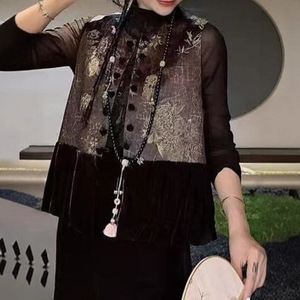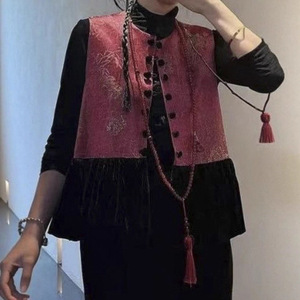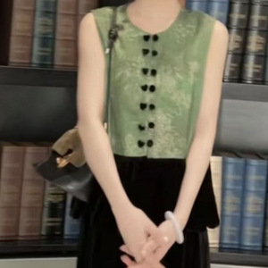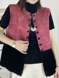 新款新中式复古圆领马甲秋季韩版丝绒拼接爱心扣无袖外套马甲背心