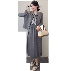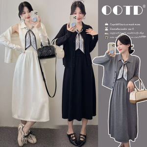 孕妇装秋冬季连衣裙小香风2025新款开衫外套哺乳背心裙两件套装