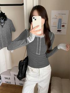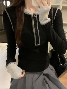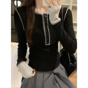 设计感撞色拼接打底衫女秋季2025纽扣V领小众上衣韩版长袖T恤