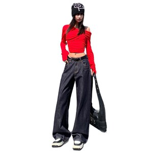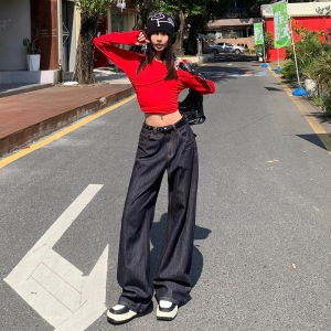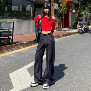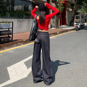 深蓝色直筒牛仔裤女秋季新款美式时尚设计感高腰宽松垂感拖地裤子