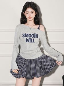 季优韩系秋季高级灰色印花一字斜露肩收腰显瘦长袖t恤假两件上衣