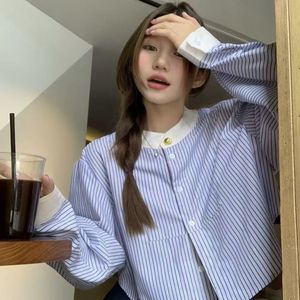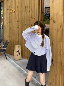 条纹长袖衬衫女春秋季防晒休闲宽松短款外套慵懒风高质量跨境批发