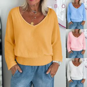 欧美跨境亚马逊秋季新款女装休闲宽松时尚纯色长袖V领套头上衣