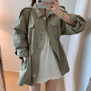 韩国chic秋季复古气质翻领拉链式暗扣抽褶收腰显瘦百搭风衣外套女