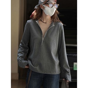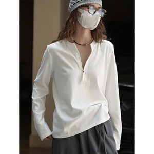 秋冬新款韩系休闲简约圆领半门襟拉链长袖T恤柔软亲肤上衣女