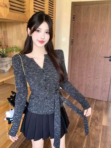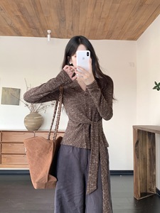 V领长袖T恤女2025早秋新款大码胖mm收腰绑带打底衫上衣