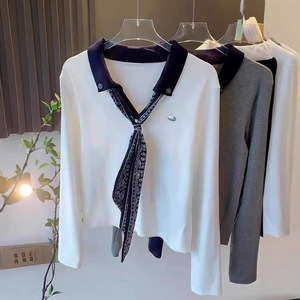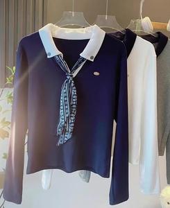 撞色翻领长袖T恤2025年秋季女装新款印花丝巾系带设计感绝美上衣