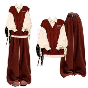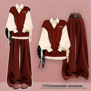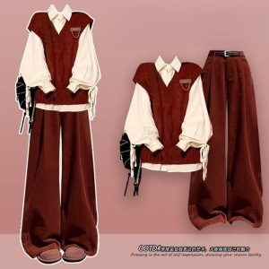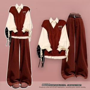 秋冬套装女感2025韩版学院风针织马甲长袖衬衫搭休闲裤三件套