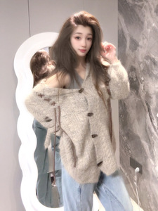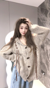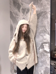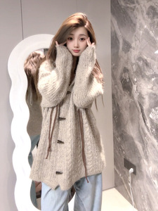 2025秋冬新款设计感小众针织衫开衫复古宽松加厚粗针连帽毛衣外套