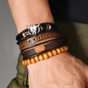 欧美跨境热销复古风现货批发串珠牛头多层皮革diy4件套男士皮手链