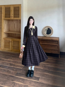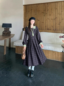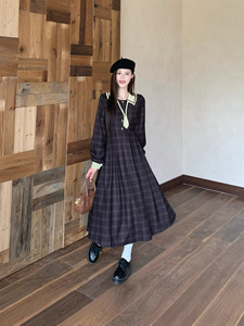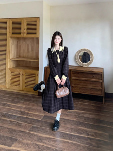 大码女装法式复古格纹学院风遮肉显瘦连衣裙秋冬款女减龄小个子长