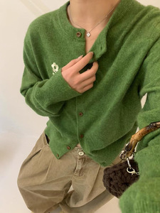 韩系绿色花朵刺绣长袖上衣针织毛衣女装秋季小众百搭休闲开衫外套