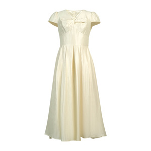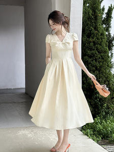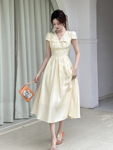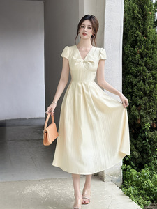 2025夏季新款女装法式设计感纽结V领收腰大摆气质长款连衣裙65415
