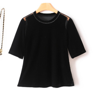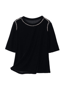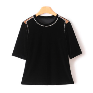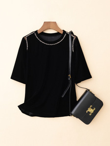 批发工厂实拍爆款 百搭气质圆领钉珠短袖丝绒内搭外穿t恤小衫上衣