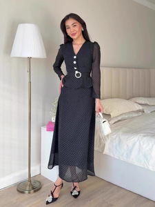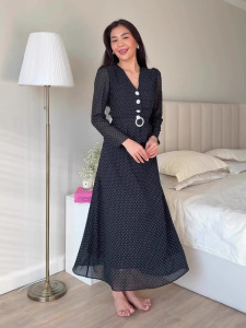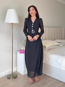 欧美亚马逊跨境外贸女装2025秋季新款高腰长袖波点V领系带连衣裙
