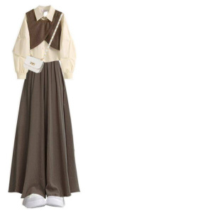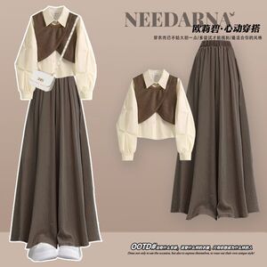 秋季套装女2025新款大码时尚拼接假两件上衣搭宽松半身裙裤两件套