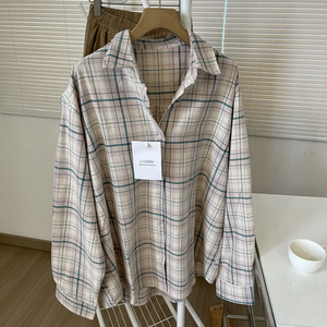 秋冬磨毛粉色格子宽松中长款加厚衬衫女叠穿慵懒休闲上衣开衫外套