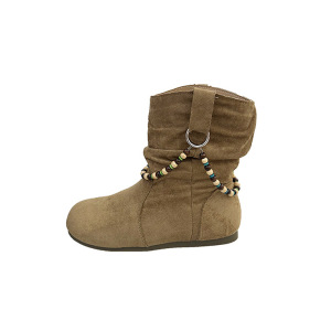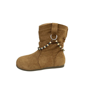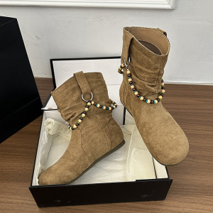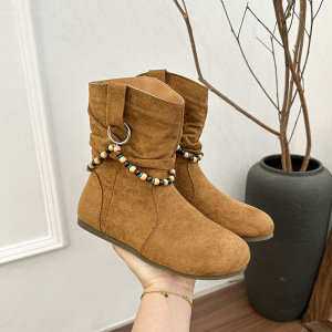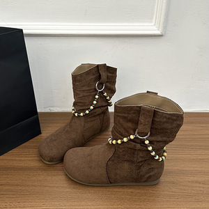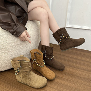 复古磨砂皮堆堆靴女2025秋冬新款休闲显瘦靴子串珠平底勃肯短筒靴