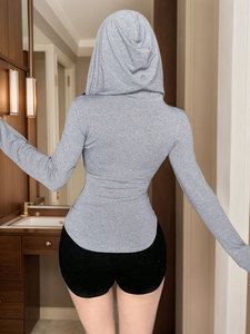 2025年跨境亚马逊独立站女式拉链短款合身纯色连帽修身收腰针织衫