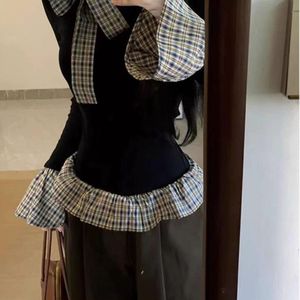 韩系chic假两件长袖t恤女春秋新款格纹拼接修身内搭打底衫上衣潮