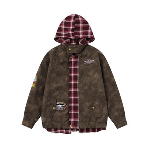 TKPA美式复古格纹拼接假两件pu皮衣外套男女宽松飞行员夹克上衣潮