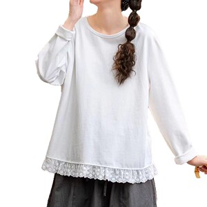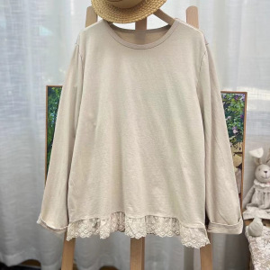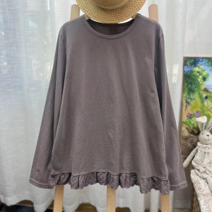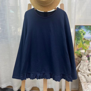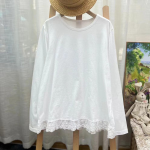简约日系休闲针织棉长袖打底T恤气质百搭棉质打底衫圆领花边下摆