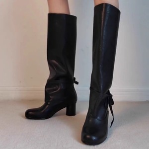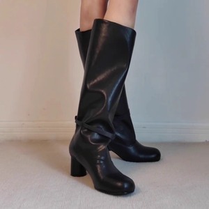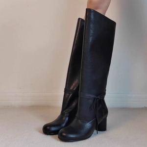 羊皮版~2025新款法式小众圆头高筒粗跟显瘦长筒绑带显瘦时装靴女