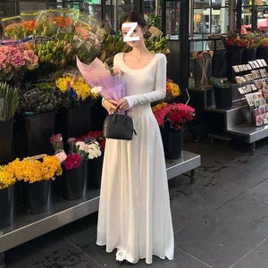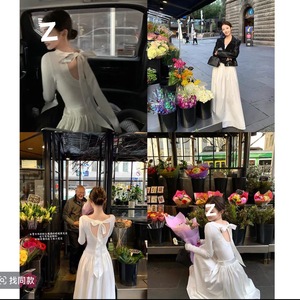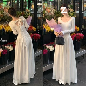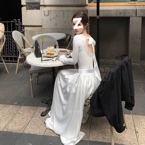 法式白色露背绑带长袖收腰显瘦连衣裙遮肉气质名媛蝴蝶结大摆长裙