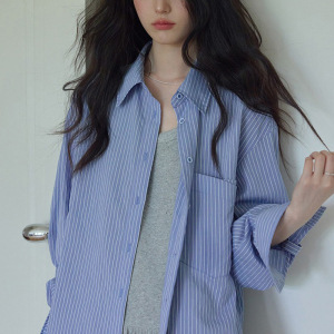 知识分子风蓝白竖条纹长袖衬衫早秋宽松显瘦休闲衬衣