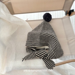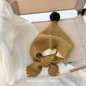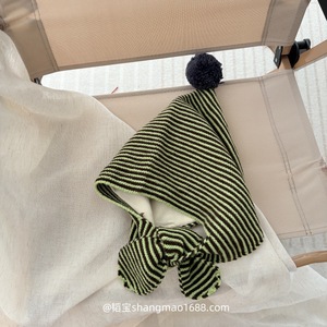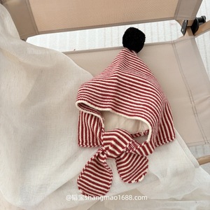 儿童帽子围脖一体帽可爱条纹毛球套头帽女宝宝护耳帽防风秋冬保暖