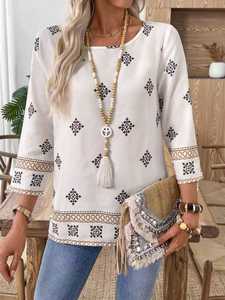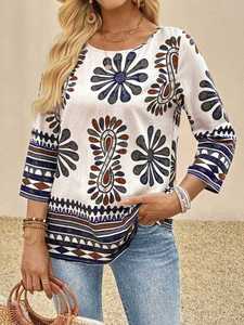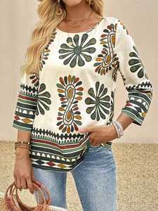 2025新款秋季跨境女式优雅时尚圆领印花长袖上衣T恤衬衫