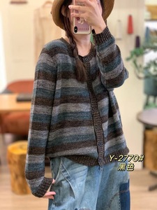 撞色条纹针织开衫女 2025秋新款复古宽松圆领棉线毛衣外套 2770
