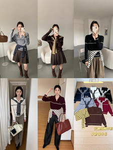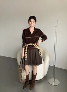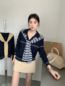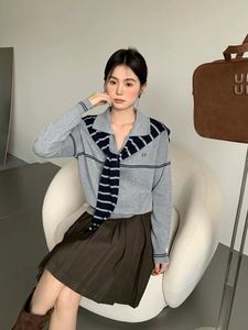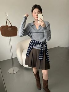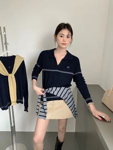 条纹坑条翻领针织T恤2025秋季新款女装简约时尚洋气套头修身上衣