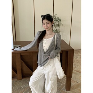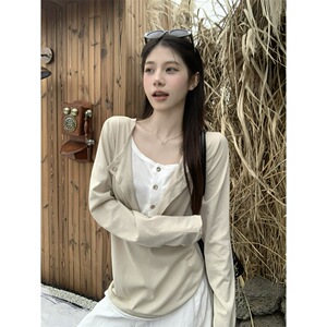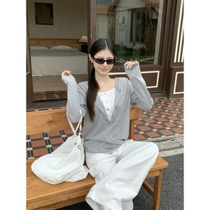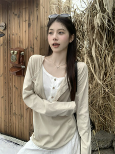 实拍 假两件长袖T恤秋季新款小众宽松慵懒休闲设计感上衣女88582