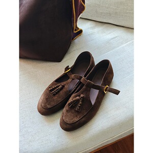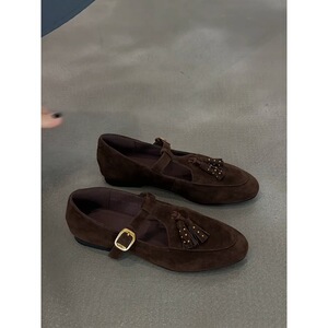 牛皮版~真皮小众流苏真皮浅口单鞋丁字扣带玛丽珍鞋女平底乐福鞋