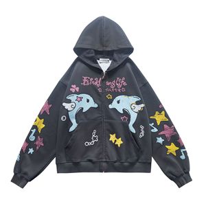 2025秋季美式复古做旧涂鸦海豚连帽卫衣女宽松休闲情侣开衫外套