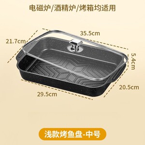 中号浅盘-碳钢不沾烤鱼盘+(钢化玻璃盖)【特厚不变形/电磁炉燃气通用】