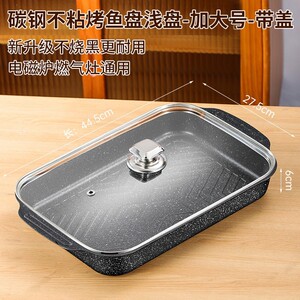 加大号浅盘-碳钢不沾烤鱼盘+(钢化玻璃盖)【特厚不变形/电磁炉燃气通用】