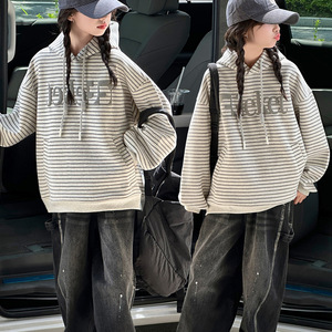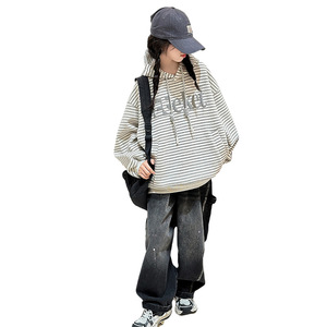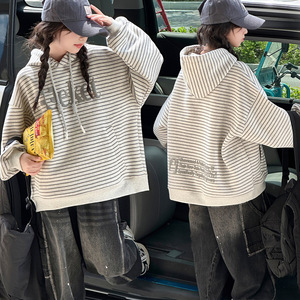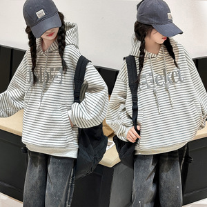 跨境女童条纹上衣2025新款儿童韩系中大童宽松连帽卫衣洋气帽衫潮