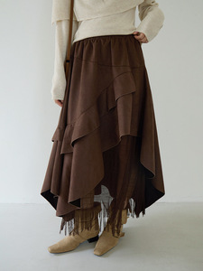 【欧凡】美拉德麂皮绒不规则半身裙女秋新款蕾丝拼接高腰长裙3149