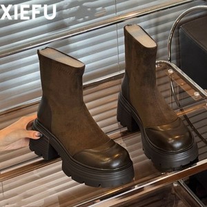瘦瘦靴粗跟短靴女2025新款秋季弹力靴绒面复古百搭增高厚底马丁靴