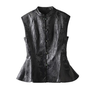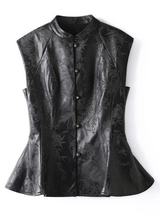 真皮皮衣HN4115初秋新款新中式国风盘扣荷叶边绵羊皮印花无袖背心