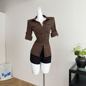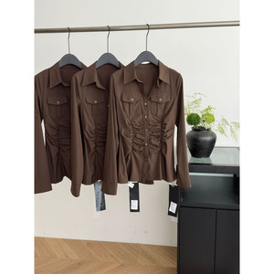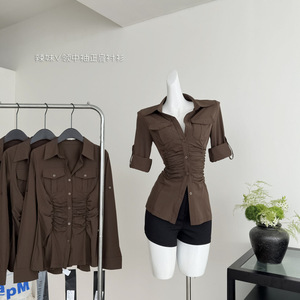 设计感收腰褶皱工装感高弹长款可调节长袖polo衬衫女