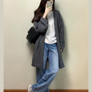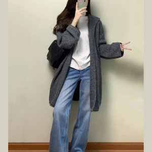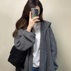 灰色中长款连帽毛衣外套女早秋季韩系气质宽松慵懒松弛感针织开衫