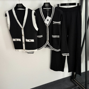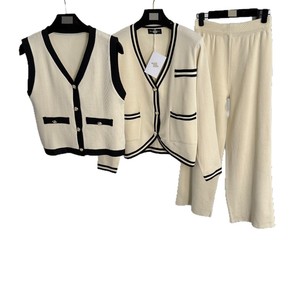 深圳南油货高端跨境女三件套装针织开衫外套+V领针织马甲+休闲长