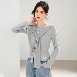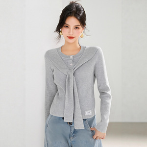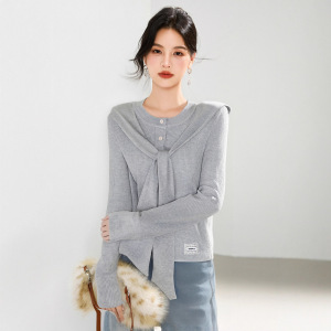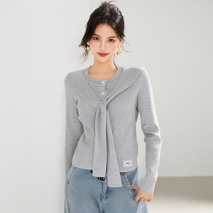 韩系假两件拼肩灰色针织开衫女2025秋冬新款圆领小个子长袖毛衣