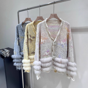 韩系秋冬新款甜美温柔针织毛衣开衫V领狐狸毛皮草外套蝴蝶年轻女