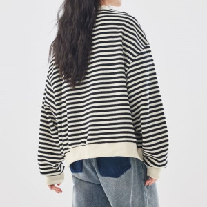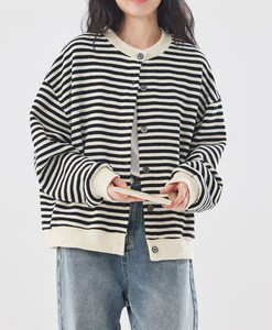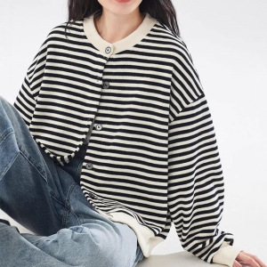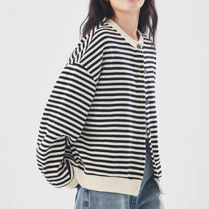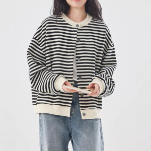 2025秋季新款女秋季宽松无帽圆领时尚条纹针织短款外套