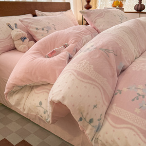 简约雕花牛奶绒床上四件套冬季加厚双面加绒珊瑚绒被套床单三件套
