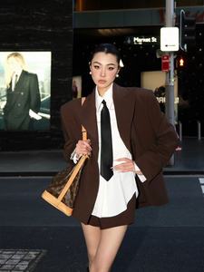 三观/25新款韩系潮流风白色衬衫+西服外套+短裤三件套